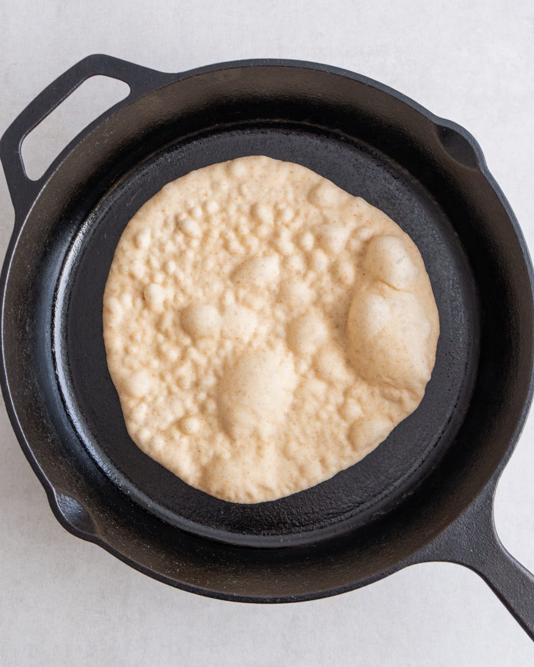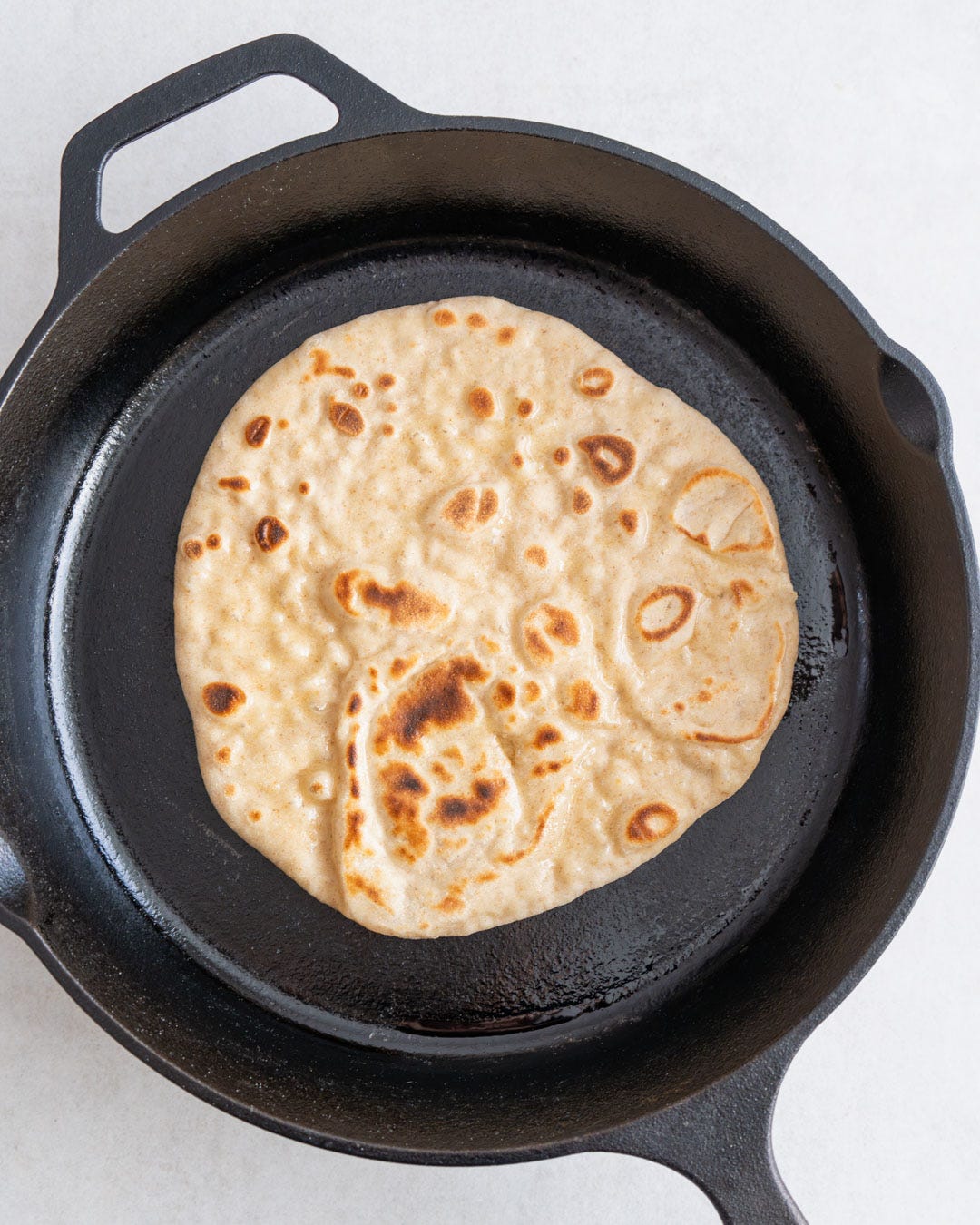 Now add the piece of dough you rolled out first to the hot pan and cook for around 1 minute until the bottom has golden spots all over.