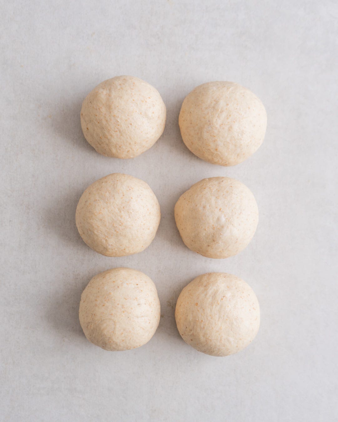 Preheat a large, heavy-based pan over medium heat. As it heats, return the dough to the work surface and divide it into six pieces (around 110g each). Shape each piece into a ball by tucking the edges underneath before stretching it over the work surface in circular movements with one hand. You are aiming to create a smooth surface across the dough. Cover the balls again.
